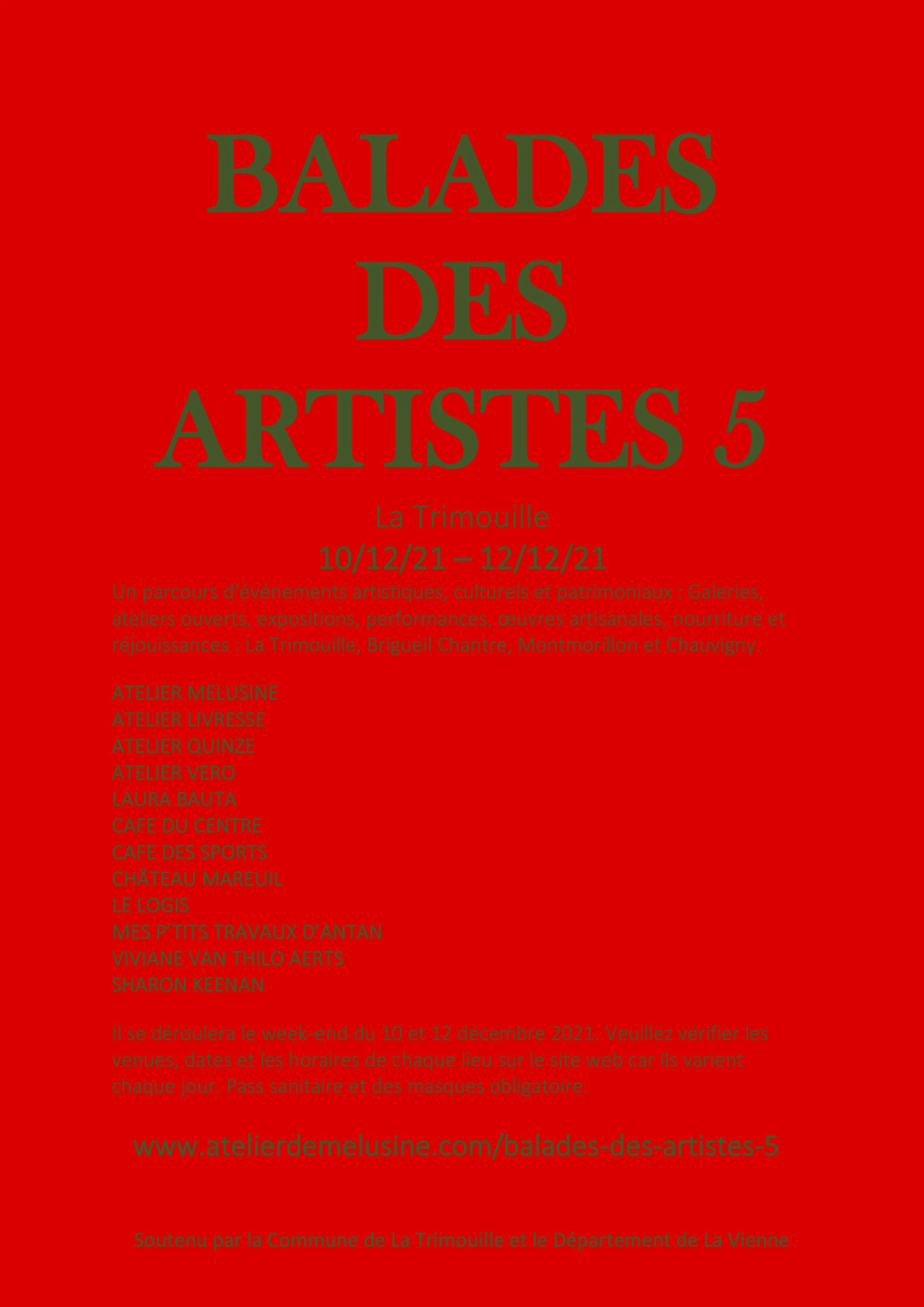 La cinquième Balade des Artistes de La Trimouille s'ouvre avec un programme chargé le 10/12/21, elle voit également les lieux s'étendre à Brigeuil Le Chantre, Montmorillon et Chauvigny, créant un parcours artistique et patrimonial avec de nombreux événements gratuits.